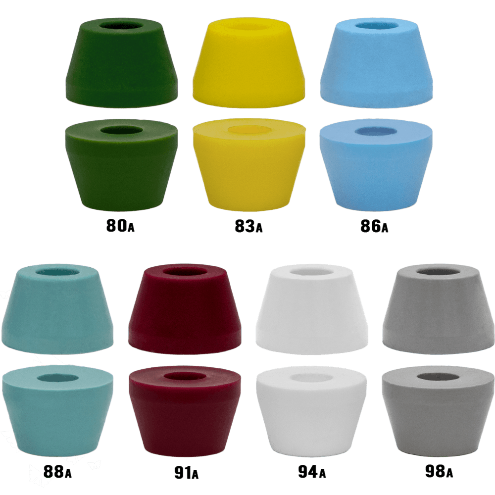 The world of bushings can become very complicated considering the large number of factors and styles on the market, but don’t let that intimidate you! Just keep in mind the two main factors and you’ll be able to differentiate between the bushings you encounter: durometer (the hardness), and shape.